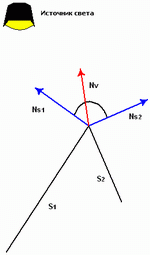 так же нормаль вершины Nv. Вы видите, что углы между нормалями поверхностей