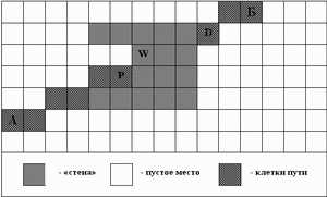Как и прежде, буквой P тут обозначены клетки пути, а буквой W - клетки стены.